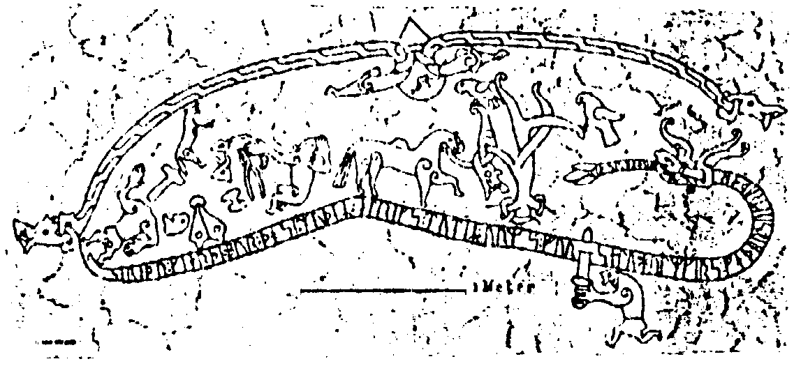minneinnskrift. Runene er hugget i et slangebånd, som viser seg å
